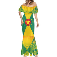 Grenada Coat of Arms Mermaid Dress with Yellow Green Flag Colors and Tribal Pattern Design