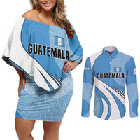 Guatemala Flag Map Couples Matching Off Shoulder Short Dress and Long Sleeve Button Shirt with Blue White Swirl and Geometric Pattern Design