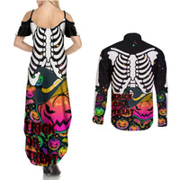 Halloween Skeleton Couples Matching Summer Maxi Dress and Long Sleeve Button Shirts Trick or Treat Witch Pumpkin Colorful