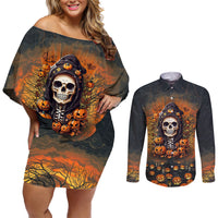 Halloween Skull Couples Matching Off Shoulder Short Dress and Long Sleeve Button Shirts Pumpkin-Themed