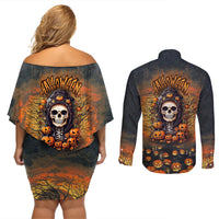 Halloween Skull Couples Matching Off Shoulder Short Dress and Long Sleeve Button Shirts Pumpkin-Themed TS04
