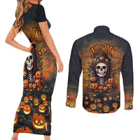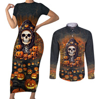 Halloween Skull Couples Matching Short Sleeve Bodycon Dress and Long Sleeve Button Shirts Pumpkin-Themed TS04