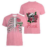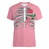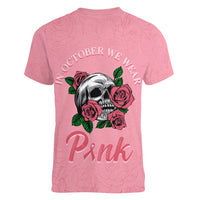 In October We Wear Pink Breast Cancer Awareness Women V Neck T Shirt Skull and Roses - Pink