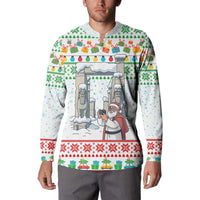 Iran Christmas Button Sweatshirt with Santa Taking Photos Ancient Columns and Snowflake Gift Pattern