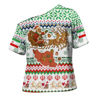 Turn heads and express your unique style with the Iran Christmas Cross Shoulder Shirt with Santa Sleigh Reindeer Map and Green Red Snowflake Pattern from Wonder Print Shop. Perfect for casual outings, festivals, or making a fashion statement, this custom-made cross shoulder shirt combines high-end craftsmanship with eye-catching design.
