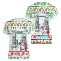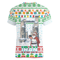 Iran Christmas Women V-Neck T-Shirt with Santa Taking Photos Ancient Columns and Snowflake Gift Pattern TS04