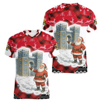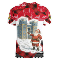 Iraq Christmas Women V-Neck T-Shirt with Santa Ishtar Gate Red Plaid and Snowflake Reindeer Pattern