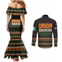 Ivory Coast Couples Matching Mermaid Dress and Long Sleeve Button Shirt with Ethnic Geometric Pattern and National Motto Design