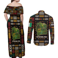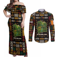 Ivory Coast Couples Matching Off Shoulder Maxi Dress and Long Sleeve Button Shirt with Taï National Park Wildlife Map Design