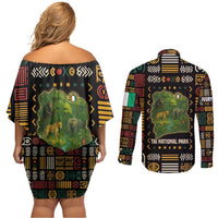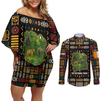 Ivory Coast Couples Matching Off Shoulder Short Dress and Long Sleeve Button Shirt with Taï National Park Wildlife Map Design