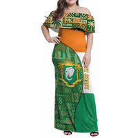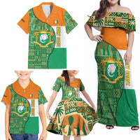 Ivory Coast Family Matching Off Shoulder Maxi Dress and Hawaiian Shirt with Elephant Crest and Tribal Pattern Design