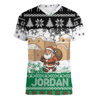 Jordan Christmas Women V-Neck T-Shirt with Santa Snow Village Green and Black Snowflake Tree Pattern TS04