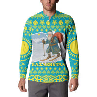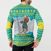 Kazakhstan Christmas Button Sweatshirt with Santa Skiing in Traditional Outfit Snow Mountain and Sun Pattern TS04