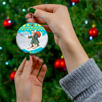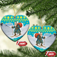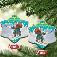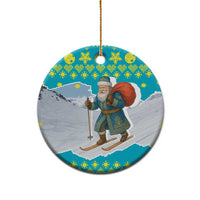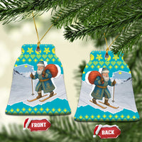 Kazakhstan Christmas Ceramic Ornament with Santa Skiing in Traditional Outfit Snow Mountain and Sun Pattern