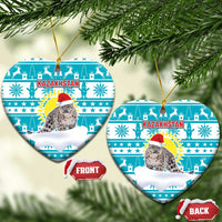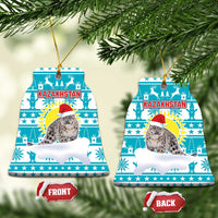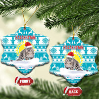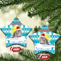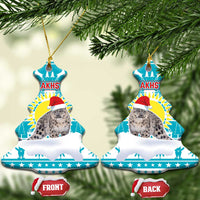Kazakhstan Christmas Ceramic Ornament with Snow Leopard in Santa Hat Blue and Yellow Reindeer Snowflake