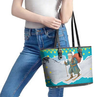Kazakhstan Christmas Leather Tote Bag with Santa Skiing in Traditional Outfit Snow Mountain and Sun Pattern