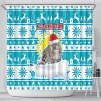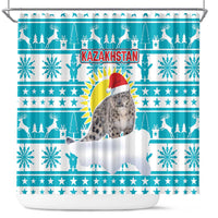 Kazakhstan Christmas Shower Curtain with Snow Leopard in Santa Hat Blue and Yellow Reindeer Snowflake