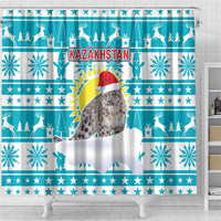 Kazakhstan Christmas Shower Curtain with Snow Leopard in Santa Hat Blue and Yellow Reindeer Snowflake TS04