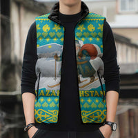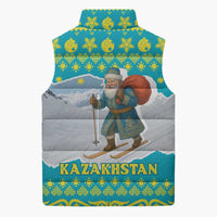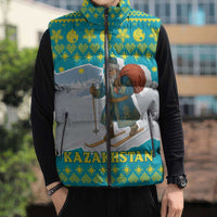 Get your Kazakhstan Christmas Sleeveless Puffer Jacket with Santa Skiing in Traditional Outfit Snow Mountain and Sun Pattern by Wonder Print Shop today and experience warmth, style, and versatility in one perfect piece.