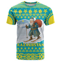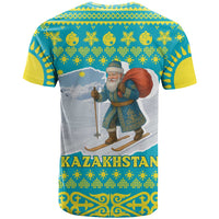 Kazakhstan Christmas T Shirt with Santa Skiing in Traditional Outfit Snow Mountain and Sun Pattern TS04