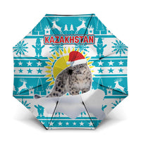 Kazakhstan Christmas Umbrella with Snow Leopard in Santa Hat Blue and Yellow Reindeer Snowflake