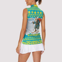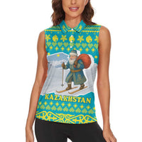 Kazakhstan Christmas Women Sleeveless Polo Shirt with Santa Skiing in Traditional Outfit Snow Mountain and Sun Pattern