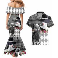 Kentucky Racing Horses Derby Hat Lady Couples Matching Mermaid Dress and Hawaiian Shirt Churchill Downs and Roses Grayscale LT03