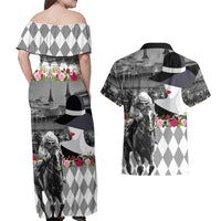 Kentucky Racing Horses Derby Hat Lady Couples Matching Off Shoulder Maxi Dress and Hawaiian Shirt Churchill Downs and Roses Grayscale LT03