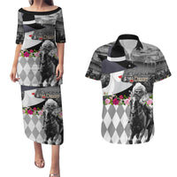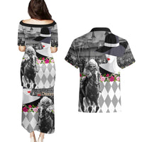 Kentucky Racing Horses Derby Hat Lady Couples Matching Puletasi and Hawaiian Shirt Churchill Downs and Roses Grayscale