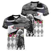 Kentucky Racing Horses Derby Hat Lady Women V-Neck T-Shirt Churchill Downs and Roses Grayscale LT03