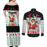 Kuwait Christmas Couples Matching Off Shoulder Maxi Dress and Long Sleeve Button Shirt with Santa Taking Selfie Kuwait Towers Reindeer and Snowflake