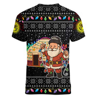 Kyrgyzstan Christmas Women V-Neck T-Shirt with Santa Decorating Yurt Colorful Lights Snowflakes and National