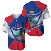 Liechtenstein Baseball Jersey with Red Blue Mountain Landscape Design and Crown Emblem