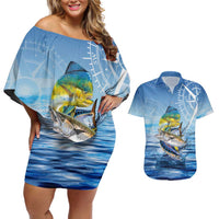 Mahi Mahi and Tuna Fish Couples Matching Off Shoulder Short Dress and Hawaiian Shirt Fishing Ocean Water Background and Nautical Compass Elements TS04
