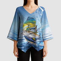 Add a chic touch to your wardrobe with the Mahi Mahi and Tuna Fish Kimono Sleeve Blouse Fishing Ocean Water Background and Nautical Compass Elements from Wonder Print Shop. Designed for versatility, this V-neck blouse features flowing kimono-style sleeves and a relaxed fit — perfect for both casual and dressy occasions. Crafted with premium polyester fabric, it offers a soft, lightweight feel for all-day comfort.