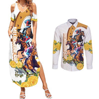 Melbourne Cup Australia Couples Matching Summer Maxi Dress and Long Sleeve Button Shirt Horse Racing Horseshoe Mix Yellow Roses