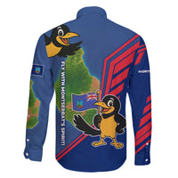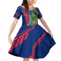 Montserrat Family Matching Off Shoulder Short Dress and Hawaiian Shirt with Cartoon Bird and Island Map Blue Red Stripe Design TS04