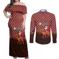 Morocco Christmas Couples Matching Off Shoulder Maxi Dress and Long Sleeve Button Shirt with Santa Claus Camel Caravan Desert Scene and Red Pattern Design