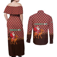 Morocco Christmas Couples Matching Off Shoulder Maxi Dress and Long Sleeve Button Shirt with Santa Claus Camel Caravan Desert Scene and Red Pattern Design TS04