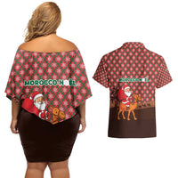 Morocco Christmas Couples Matching Off Shoulder Short Dress and Hawaiian Shirt with Santa Claus Camel Caravan Desert Scene and Red Pattern Design
