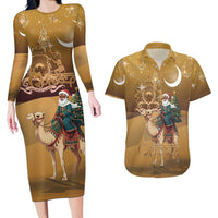 Morocco Christmas in Sahara Couples Matching Long Sleeve Bodycon Dress and Hawaiian Shirt Black Santa Riding Camel