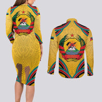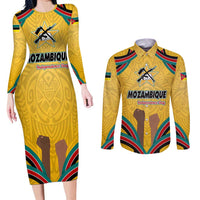 Mozambique Couples Matching Long Sleeve Bodycon Dress and Long Sleeve Button Shirt with Yellow Red Green Swirl Design and Independence Day