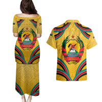 Mozambique Couples Matching Puletasi and Hawaiian Shirt with Yellow Red Green Swirl Design and Independence Day