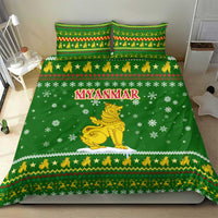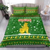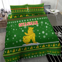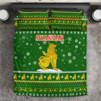 Myanmar Christmas Bedding Set with Green-Gold Theme, Chinthe Lion, and Santa Motif