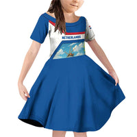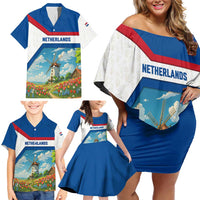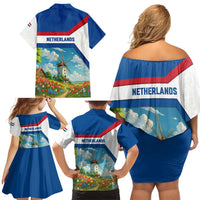 Netherlands Family Matching Off Shoulder Short Dress and Hawaiian Shirt Dutch Windmill and Tulip Field Landscape in National Flag Colors
