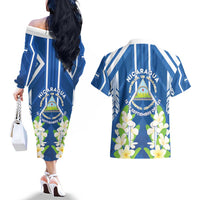 Nicaragua Independence Day 1821 Couples Matching Off The Shoulder Long Sleeve Dress and Hawaiian Shirt Coat Of Arms With Plumeria