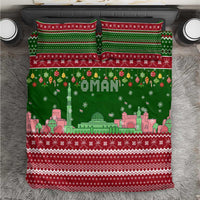 Oman Christmas Bedding Set with Green-Red Pattern, Mosque and Fort Landmarks, and Festive Ornament Motif