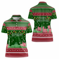 Oman Christmas Women Polo Shirt with Green-Red Pattern, Mosque and Fort Landmarks, and Festive Ornament Motif
