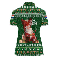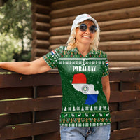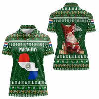 Paraguay Christmas Women Polo Shirt with Green Festive Pattern, Map and Flag Motif, and Santa Illustration