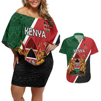 Personalised Kenya Couples Matching Off Shoulder Short Dress and Hawaiian Shirt Coat Of Arms Mix Flag Style